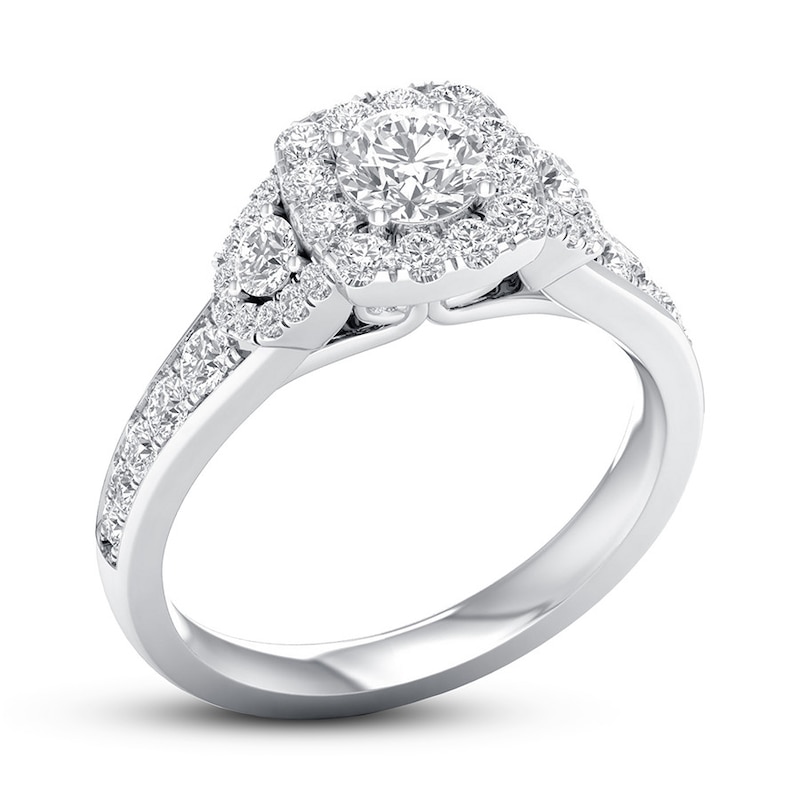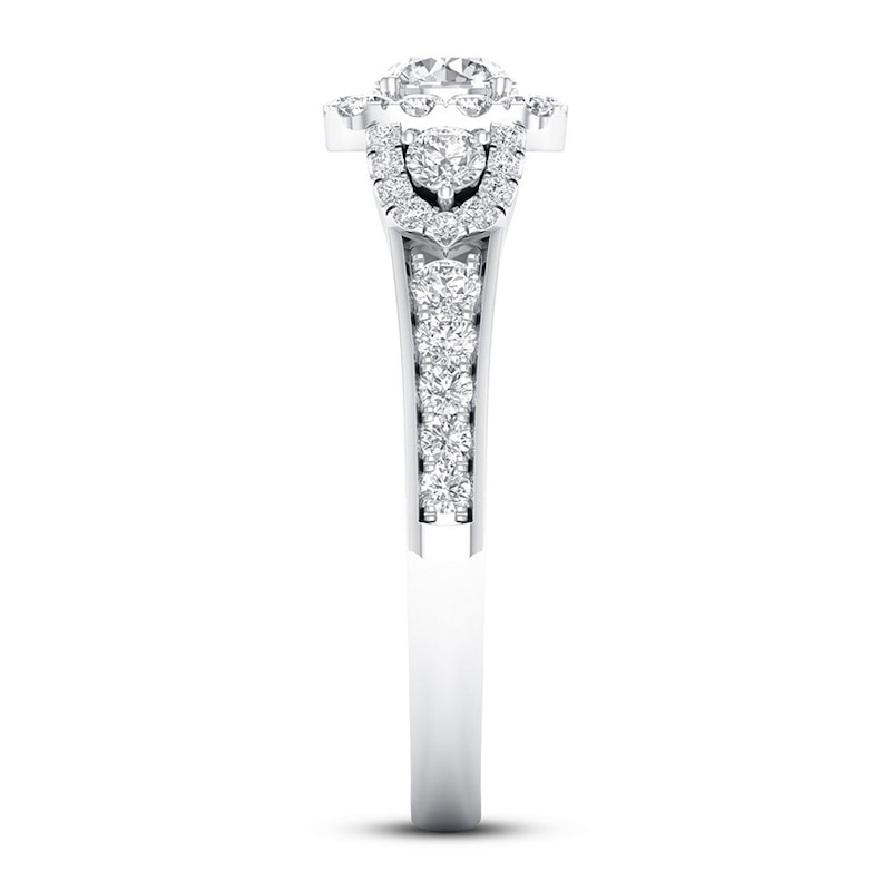 Inspired by three-stone styles, this mesmerizing engagement ring is awash in independently certified round diamonds. The center displays three primary diamonds with a halo around each stone. More diamonds enliven the band and accent leaf shapes in the profile to complete the look. Fashioned in elegant 14K white gold, the ring has a total diamond weight of 1 carat. The center diamond is laser-inscribed with a unique Gemscribe® serial number.